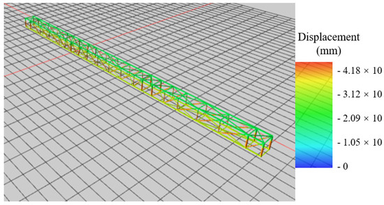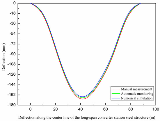 Through the real-time structural monitoring system, the results of automatic monitoring, manual measurement, and numerical simulation were compared. The maximum deflection values identified from the automatic monitoring, manual measurement, and numerical simulation were all located in the center of the long-span converter station steel structure and gradually decreased towards both ends, as shown in Figure 17.