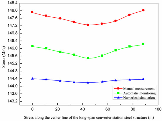 The maximum stress values identified from the numerical simulation, manual measurement, and automatic monitoring were all located at both ends of the converter station steel structure and gradually decrease towards the center, while the overall stress changed little, as shown in Figure 18.