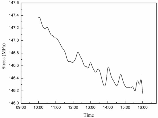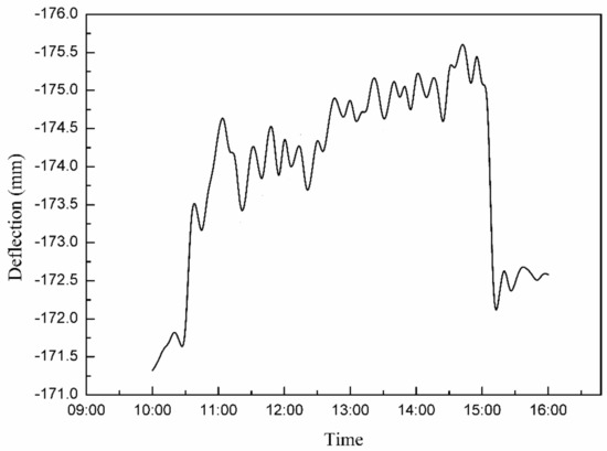 The monitoring instruments were arranged according to Figure 5 and Figure 6, and the deflection, stress, and strain changes in the hoisting process were monitored, according to the monitoring frequency, once every 10 min. Steel structure hoisting started at 10:00 and ended at 16:00; thus, the whole hoisting process lasted 6 h.