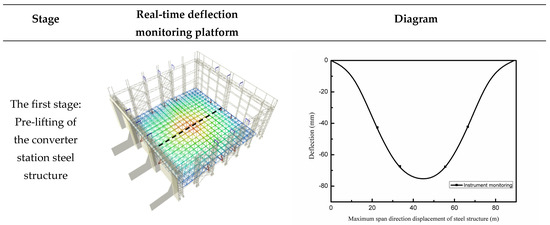 Using the characteristics of three-dimensional model visualization, the mechanical changes during project construction are clearly and intuitively displayed, and the three-dimensional lifting image is automatically generated—corresponding to the real-time lifting on site—to monitor the lifting process in real-time and ensure that the construction can be carried out in an organized way according to the design scheme. The real-time deflection monitoring platform is divided into three stages, where the numerical model of each stage corresponds to that of the monitoring system. as shown in Figure 23.