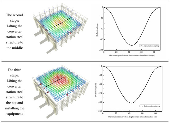 Deflection is an important parameter, which is used to reflect the bending deformation of long-span structures, and which is important to consider when evaluating engineering safety. As shown in Figure 19, from the first stage to the third stage (10:00–15:00), the deflection of the long-span converter station steel structure gradually increased from 81 mm to 86 mm. When the long-span converter station steel structure was placed on the truss of the converter station steel structure at 15:00, the deflection decreased rapidly to 82 mm, and the bending degree of the long-span converter station steel structure first increased slowly, then decreased quickly and ultimately tended to stability. As shown in Figure 17 and Figure 25, the maximum deflection of the three hoisting stages was located at the centerline of the long-span converter station steel structure; the deflections from the first stage to the third stage were 79.2 mm, 114.5 mm, and 175.8 mm, respectively, and the maximum deflection was observed in the third stage. During the construction process, members were installed in the structure in the second and third stages, such that the third stage corresponded to the largest structural load. Therefore, in the multi-point hoisting process of this long-span converter station steel structure, the deflection of the centerline of the long-span converter station steel structure under the maximum load state was the largest, making it the location most prone to engineering disasters. With the structural monitoring system, the centerline of the long-span converter station steel structure under the maximum load state was monitored. Therefore, in future long-span converter station steel structure hoisting projects, it is necessary to focus on monitoring the centerline of the long-span converter station steel structure under the maximum load state in order to ensure safe operations. During the hoisting process, the method of increasing the reverse direction force on the long-span converter station steel structure to offset the load can be used to reduce the deflection of the long-span converter station steel structure and reduce the engineering risk.