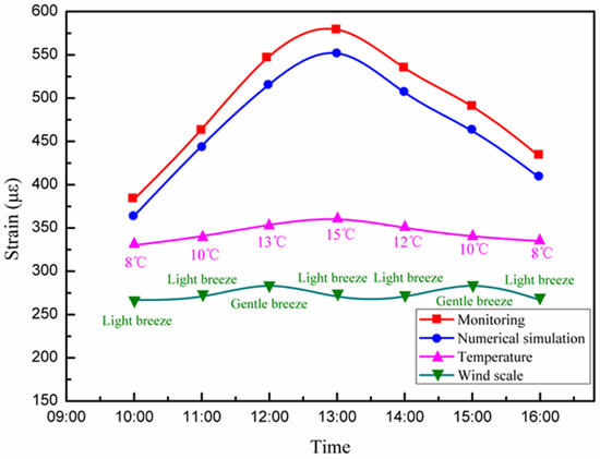Through the monitoring system, the changes in stress, strain, deflection, temperature, and wind force at the monitoring points could be output to obtain the general rule of hoisting and the monitoring images of deflection, stress, strain, temperature, and wind force at certain points, as shown in Figure 19 and Figure 20.