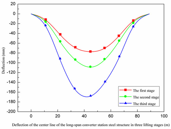 Deflection of the centerline of the long−span converter station steel structure in three lifting stages.