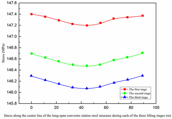 Stress along the centerline of the long−span converter station steel structure during each of the three lifting stages.