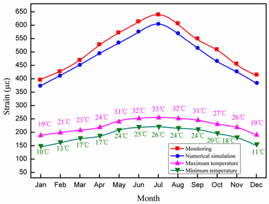 Annual variation in the temperature and strain of the long-span converter station steel structure.