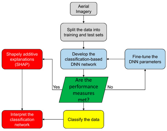 Deep neural networks (DNN) have become extremely popular techniques in remote sensing applications, which recognize features in several levels of representation [36]. This is due to the fact that these approaches may easily encode spectral and spatial information from raw images without the need for any preprocessing [37]. They are also a hierarchical structure of deep neural networks and include a number of interconnected layers that may learn a hierarchical feature representation from the data and extract the deep features of the input data [37]. Therefore, we implemented a DNN model in the current work to address the limitation of conventional classification approaches in vegetation mapping from high-resolution remotely sensed imagery. When building a classification model, it is critical to understand why each classification is made, except achieving high accuracy. Due to the complicated architecture of DNNs [38], interpreting the output of these models is typically thought to be extremely difficult [38].