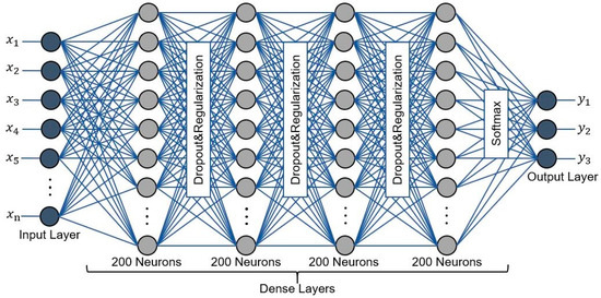The suggested method’s architecture is based on a multilayer feed-forward neural network that is organized as below: (1) the input layer has several features representing the class descriptors. (2) There are seven hidden layers. Four layers are dense layers, and three regularization and dropout layers were inserted between them to avoid the over-fitting problem. (3) To influence the collection of obtained features from the final hidden layer to the appropriate class, the Softmax classifier was applied in the last layer. (4) The input layer was regulated based on the kernel regularization method, and the ReLU activation function was also implemented to avoid saturation during the learning process. Moreover, to maintain as many features as feasible, we deleted the pooling operation. This is due to the fact that we want to capture more contextual information and identify fine details [50]. We used Python and the Keras with TensorFlow as a backend to apply the entire process of the suggested model for vegetation mapping from aerial data.