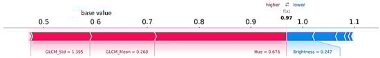 In this section, we graphically presented the features explanations achieved by the SHAP approach. A bar plot, which illustrates the global relevance of the features, or a partial dependence plot, which shows the impact of shifting an individual characteristic, is commonly used to depict the influence of the features in a model [55]. However, other forms of visualizations are possible since SHAP values are outcomes of individualized attributes that are specific to every prediction. Because SHAP dependence graphs reflect the impacts of feature relationships better than partial dependence plots, they are a good alternative to partial dependence plots. To highlight the global significance, SHAP summary graphs replace usual bar plots, and local explanations are displayed using force plots [55]. For example, Figure 4 shows an explanation of a prediction (vegetation class) obtained with a DNN model based on a force plot. The explanation demonstrates how multiple factors work together to push the output of the method from the “base” to the “predicted” value for the initial prediction. The prediction process begins with the baseline. The average of all predictions is the baseline for Shapley values. Each Shapley value is represented by an arrow in the plot, indicating whether the prediction should be increased or decreased. Features that cause a high classification value are represented in red, while those that cause a lower value are indicated in blue. For example, for the vegetation class, the sample has a prediction of 0.97, while the baseline is 0.6. The Hue, GLCM_Std, and GLCM_Mean can improve the final output prediction while Brightness can reduce the prediction.
