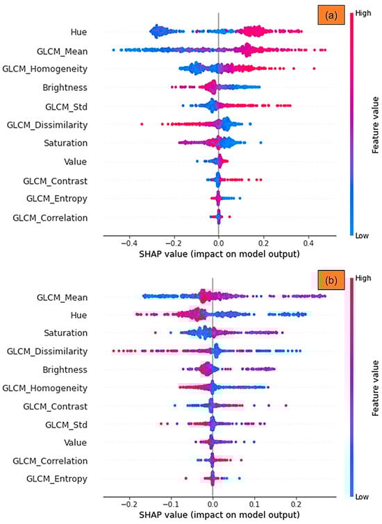 The DNN model’s SHAP summary plot for: (a) non-vegetation; and (b) vegetation classes. The higher classification is related to the higher SHAP value of a feature.