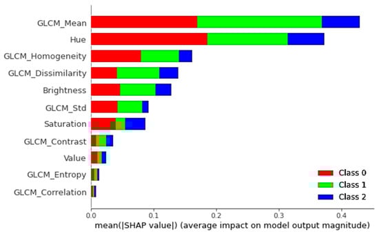 In addition, we used a summary plot to integrate the feature’s significance with the feature’s impacts. A Shapley value for a feature and a sample is represented by each point on the summary plot. Figure 5a,b, present the summary plots for the non-vegetation and vegetation classes for different labels, respectively. The x-axis determines the Shapley value, and the y-axis shows the features. The color denotes the feature’s value, which ranges from low to high. We can get a sense of Shapley values dispensation per feature using overlapping points that are jittered in the direction of the y-axis. The features are ranked in order of significance [53]. For example, Figure 5a shows that a high degree of Hue, GLCM_Mean and GLCM_Homogeneity contents have a significant and beneficial impact on classification. The red color represents a high, and the x-axis represents a positive value. On the opposite, the feature saturation is negatively related to the target factor. Moreover, for the normal bar graph, as shown in Figure 6, we could take the average absolute value of SHAP values to every feature. The SHAP values on the x-axis represent the magnitude of the difference in log-odds. In Figure 5, we can see how SHAP values are allocated to the features globally. All features are continual in this scenario, and their average influence on classification is vertically arranged. We can observe how GLCM_Mean has the most significant power on the classification of Class 1 that is High-Vegetation class, while Hue showed a high effect on the Class 0 (Background) classification. In the same manner, high values of GLCM_Homogeniety and GLCM_Dissimilarity are similarly crucial in the classification of non-vegetation and vegetation classes.