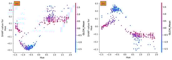 SHAP dependence plots for the DNN method regarding to Hue and GLCM_Mean for non-vegetation (a) and vegetation (b) classes.