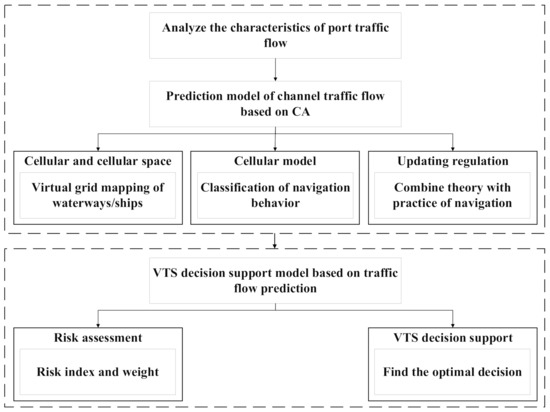 Considering maritime navigation risks from a global perspective can more effectively assist VTS operators in proper navigation management. The objective of this paper is to develop a systematic dynamic risk model based on an integration of different safety factors, which could enhance the accuracy of the system risk appraisal and management. This paper introduces a cellular automata (CA) and simulation approach supported by the Python development framework that first integrates real input data for traffic flow simulation, and secondly brings the simulation results into a risk assessment model for a dynamic risk assessment. The main computational component of the proposed method is the traffic flow simulation based on CA, while the risk assessment is a multicriteria evaluation based on the simulation results. Because the number of ships in the water area is limited, under the framework of the CA algorithm, ships only need to calculate the distance from the ships in and before their own channel and the ships before and after their adjacent channel. The computational efficiency of the proposed method can be used in practical maritime and traffic applications. The overall working idea of the paper is shown in Figure 1.