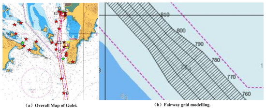 As a regular square grid is not always the most appropriate, especially as a given channel is very unlikely to fit such a regular area, a context-based spatial structure was retained and based on the main channel axis as illustrated in Figure 2b. Figure 2a is the overall waterway map of Gulei Port in Zhangzhou, in which the red is the main waterway of Gulei Port. The quadrangle longitude and latitude coordinates of each small grid were generated according to the common ship footprint; this is appropriate for the modelling approach as well as being convenient for ship visualization. Considering that small fishing boats at sea are about 7 m long, the length of the grid along the channel axis was set as 5 m for computational and accuracy purposes.