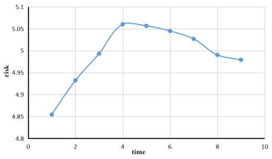 The traffic flow evaluation for a given port takes into account the whole port traffic flow and the risk in the water area that evolves over time. Based on the historical traffic flow data of a given port, a traffic flow simulation of a section of a given route can be carried out. The main statistics of the ship’s changing parameters encompass ship speed, the number of encounters between ships, and the number of encounters between ships in the given water area. Combined with the existing risk assessment of a single ship in a certain period, Formula (10) was used to consider whether the maximum risk of ships has a greater impact on the overall traffic flow risk, and the weights of parameters A and B, 0.4 and 0.6, respectively, were used to calculate the changes in the overall traffic flow risk. Taking each time point as a node, the overall traffic risk of the target water area was calculated, and the risk-time curve was drawn. The results are shown in Figure 6.