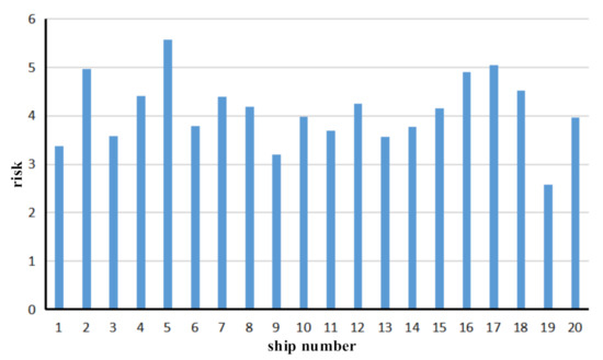For the risk assessment of each ship in port waters for a given period, the risk value of a single ship in the given period can be calculated. Similarly, the risks associated with our sample of 20 ships can be calculated as shown in Figure 7.