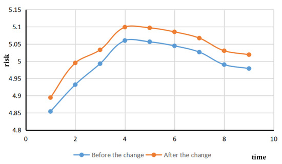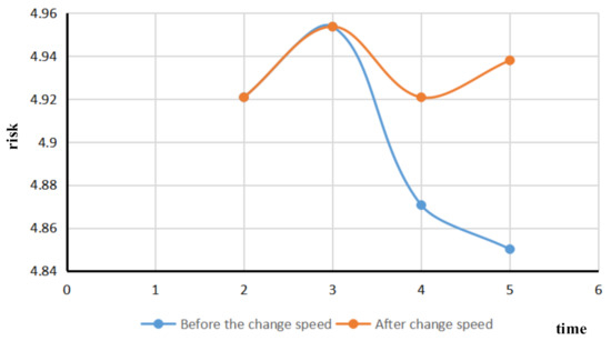 Based on the real-time risk assessment of existing ships in port waters, the risk variation of ship traffic flow was simulated after a ship changes its speed. The vessel with the MMSI vessel identification number 800000842 was selected to reduce the vessel speed at period four. The comparison diagram of the change of ship speed traffic flow risk is shown in Figure 8.