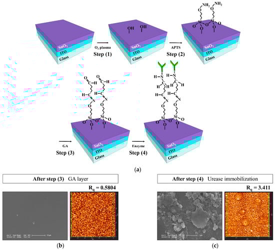 (a) Schematic diagram of the covalent bond process on the SnO2 sensing membrane of the EG. SEM and AFM images of the SnO2 membrane surface after (b) Step 3 (GA) and (c) Step 4 (immobilization of the urease enzymes).