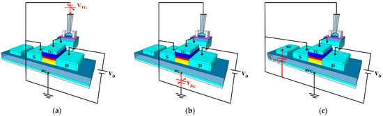 Schematics of the three different sensing modes of the proposed triple-gate a-IGZO TFT-based ISFET sensor platform: (a) TG-biasing TG-sensing (TG mode), (b) BG-biasing TG-sensing (BG mode), and (c) SG-biasing TG-sensing (SG mode).