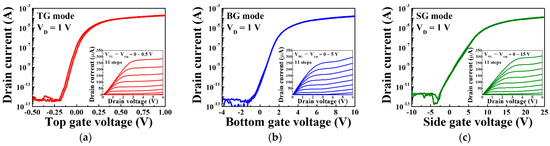 Transfer characteristic curves of triple-gate a-IGZO TFTs operating in the (a) TG, (b) BG, and (c) SG modes. The insets show the output characteristic curves corresponding to each operating mode.