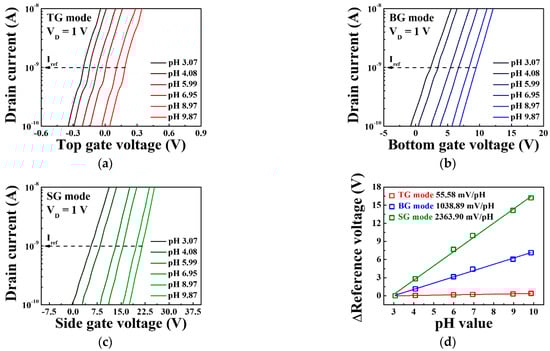 Transfer characteristic curves of the triple-gate a-IGZO TFT-based pH-ISFET sensor platform in (a) TG mode, (b) BG mode, and (c) SG mode. (d) Change in the reference voltage of the triple-gate a-IGZO TFT-based pH-ISFET sensor platform as a function of pH.