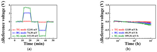 Figure 8 shows the stability and reliability test of the triple-gate a-IGZO TFT-based pH-ISFET sensor platform as determined by measuring the hysteresis voltage and drift rate. The hysteresis voltage shown in Figure 8a is caused by the micro potential charge of the sensing membrane, which occurs when the ions in the pH electrolyte react slowly with the sensing membrane [22]. We defined the hysteresis voltage as the difference between the reference voltage for the first and last pH 7 in the pH loop (pH 7 → 10 → 7 → 4 → 7). The hysteresis voltages for the TG, BG, and SG modes were 12.01, 74.30, and 115.10 mV, respectively. The drift rate is the change in reference voltage per hour, which results from the micro potential charge caused when ions penetrate the sensing membrane over a long period [23]. The drift rates in the TG, BG, and SG modes were 13.89, 60.39, and 109.36 mV/h, respectively, as shown in Figure 8b. The sensing parameters of triple-gate a-IGZO TFT-based pH-ISFET sensor platform are summarized in Table 3. Compared to the TG mode, the BG mode has 18.7 times higher sensitivity, 6.2 times greater hysteresis voltage, and 4.3 times higher drift rate, while the SG mode has 42.5 times higher sensitivity, 9.6 times larger hysteresis voltage, and 7.9 times higher drift rate. This suggests that the SG mode has better stability and reliability than the other modes because its increases in hysteresis, voltage and drift rates are relatively low compared to its increase in sensitivity.