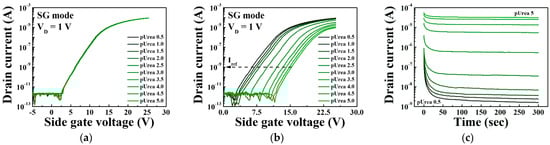 The proposed triple-gate a-IGZO TFT-based ISFET sensor platform is capable of detection in three operating modes, which are shown in Figure 4: (a) TG-biasing TG-sensing (TG mode), (b) BG-biasing TG-sensing (BG mode), and (c) SG-biasing TG-sensing (SG mode). The TG mode functions like a conventional ISFET, where the BG electrode is grounded and measures the drain current while sweeping the TG bias voltage is delivered through the reference electrode, as shown in Figure 4a. In contrast, the BG mode measures the drain current while grounding the TG electrode and sweeping the BG bias voltage, as shown in Figure 4b. The SG mode measures the drain current while sweeping the SG bias voltage by grounding the TG and floating the BG, as shown in Figure 4c. In particular, BFG in Figure 4c refers to the BG in a floating state. Table 1 summarizes the bias conditions for each gate voltage in the three operating modes of the triple-gate a-IGZO TFT-based ISFET sensor platform.