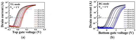 In contrast, in the BG mode, the sensitivity can be amplified by the capacitive coupling effect between the top and bottom of the TFT channel. Thus, the threshold voltage of the BG () driven by the BG mode is given not only by from electrolyte but also by the capacitance ratio between and . In this mode, is a series combination of the TG capacitance and the channel depletion capacitance , while is the BG capacitance . Then, the sensitivity of the BG mode according to the BG voltage sweep is given by Equation (2) [19]: