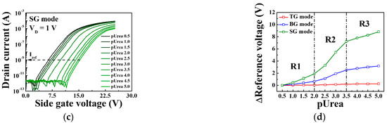 Figure 10 shows the sensing characteristics for the urease-urea reaction of the triple-gate a-IGZO TFT-based urea-EnFET sensor platform in the TG, BG, and SG modes for various urea concentrations. To validate the triple-gate a-IGZO TFT-based urea-EnFET sensor platform, we detected urea for a wide range of urea concentrations: from pUrea 0.5 to pUrea 5 (10 μM to 316 mM) in PBS buffer solution. The transfer characteristic curves for the urea-EnFET sensor platform in the TG, BG, and SG modes as a function of urea concentration are shown in Figure 10a,b, and Figure 10c, respectively. The end-product of the urease–urea reaction decreases the surface potential of the SnO2 sensing membrane such that when the urea concentration increases, the surface potential decreases, and the reference voltage shifts in a positive direction. As a result, the shift of the transfer characteristic curve was larger in the BG mode than in the TG mode and greater in the SG mode than in the BG mode. Figure 10d shows the shift in the reference voltage in the TG, BG, and SG modes for various urea concentrations, as extracted from Figure 10a–c. The shift in the reference voltage due to the urease-urea reaction can be divided into three regions: (R1) a small change in the reference voltage for large urea concentrations from pUrea 0.5 to pUrea 2, (R2) the greatest change in the reference voltage from pUrea 2 to pUrea 3.5, and (R3) a small change in the reference voltage for low urea concentrations from pUrea 3.5 to pUrea 5. The low response in R1 is due to the excessive concentrations of OH− ions and by-products of the urease and urea reaction. At high OH− ion concentrations in the electrolytes, the urease enzyme exhibits lower reactivity toward urea. The high response in R2 is most useful for urea electrolyte detection because it results in a higher voltage shift, whereas the low voltage shift in R3 is due to the low urea concentration.
