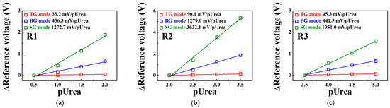 Change in the reference voltage for the TG, BG, and SG modes of the triple-gate a-IGZO TFT-based urea-EnFET sensor platform as a function of pUrea in the (a) R1, (b) R2, and (c) R3 regions.