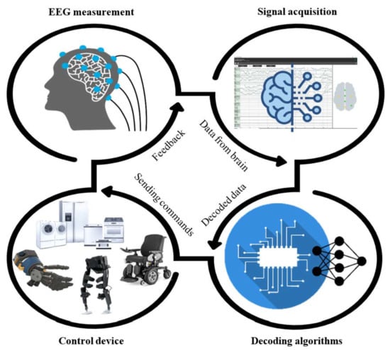 Most people know someone or have heard of someone who suffers from paralysis. In most cases, people become paralyzed because of accidents or medical conditions that partially or entirely affect the way their muscles and nerves function. People with disabilities do not usually receive the support they need because caring for them can be very expensive. Brain–computer interface (BCI) technology is now implemented in the treatment of patients suffering from physical impairments [1,2,3]. This technology promises to significantly enhance the quality of life of such patients by considerably improving their autonomy and mobility. Moreover, the idea of interfacing brains with machines has long captured human imagination [2]. Paralyzed people with neurological diseases (e.g., locked-in syndrome, muscular dystrophy, amyotrophic lateral sclerosis, brainstem stroke, and spinal cord injury) experience difficulties, such as in walking, speaking, and writing, because they lose fine motor control or lack a complete control of their voluntary muscles. However, their thinking capabilities are usually the same as those of nondisabled individuals. Generally, such patients are conscious and their mental abilities are unimpaired.