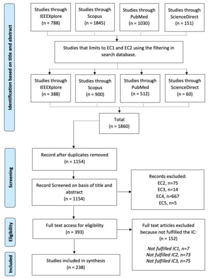 A considerable number of papers were analyzed, including those concerned with assistive, adaptive, and rehabilitative BCI technologies. This SLR retrieved 1860 articles; however, only 238 articles were included after screening using the aforementioned eligibility criteria. EC2 was employed again because some databases did not provide specific research type filters (Figure 3). Further, some reviews and survey papers are often identified as journal types.