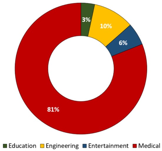 Medical: This is the most popular research area in this SLR, with 193 articles. g.Tec equipment was used in 54 articles for the EEG method [80,81,82,83,84,85,86,87,88,89,90,91,92,93,94,95,96,97,98,99,100,101,102,103,104,105,106,107,108,109,110,111,112,113,114,115,116,117,118,119,120,121,122,123,124,125,126,127,128,129,130,131,132,133], 33 articles used Emotiv equipment [134,135,136,137,138,139,140,141,142,143,144,145,146,147,148,149,150,151,152,153,154,155,156,157,158,159,160,161,162,163,164,165,166], and 24 articles used Compumedics Neuroscan equipment [167,168,169,170,171,172,173,174,175,176,177,178,179,180,181,182,183,184,185,186,187,188,189,190]. Further, 16 articles used Brain Products equipment [191,192,193,194,195,196,197,198,199,200,201,202,203,204,205,206], 13 articles used NeuroSky equipment [207,208,209,210,211,212,213,214,215,216,217,218,219], and Neuroelectrics [220,221,222,223,224,225,226,227] and OpenBCI [228,229,230,231,232,233,234,235] equipment were used in eight articles each. Moreover, seven articles used Biosemi equipment [236,237,238,239,240,241,242], and four articles used Medical Computer Systems equipment [243,244,245,246]. Three articles used Medicom MTD equipment [247,248,249], and another three articles used the equipment from InteraXon company [250,251,252]. Two articles each used Advanced Brain Monitoring [253,254] and Nihon Kohden [255,256] equipment. One article each used the equipment of Mega Electronic [257], Jordan NeuroScience Inc. [258], BIOPAC Systems Inc. [259], Laxtha Inc. [260], TMSi [261], NeuroBioLab [262], Cognionics Inc. [263], Jingahi [264], VIASYS Healthcare [265], ANT Neuro [266], Wearable Sensing [267], Netech [268], MindMedia [269], NCC Medical Co. [270], and Electrical Geodesics Inc. [271].