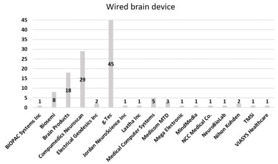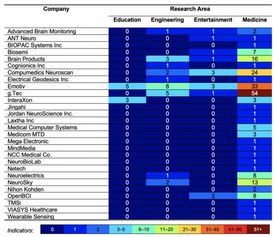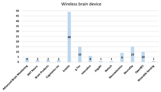 Overall, 17 companies provided more than two brands/products with different characteristics. For example, the company Neuroelectrics offers Enobio 8 and Enobia 32, which have up to 8 and 32 channels for EEG recording, respectively (https://www.neuroelectrics.com, accessed on 25 February 2021). Therefore, researchers can select the necessary equipment based on their specific goals, including user acceptance, usability, and performance. The education research area used the wireless equipment from two companies: Emotiv (Emotiv EPOC and Emotiv Insight) and InteraXon (Muse headband). While Augustian et al. [64] used the equipment of Electrical Geodesics Inc. to propose applications and devices for assisting forestry crane control.