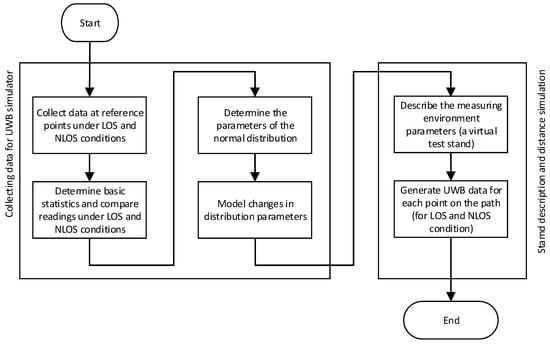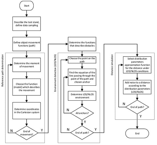 Data flow in the simulator (presented in Figure 13) is divided into three sections: determination of the reference path (reference object motion), environment detection (LOS/NLOS), and distance generation.