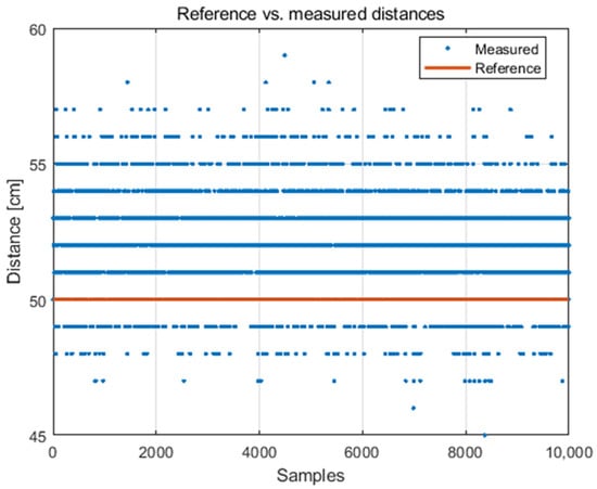 In the first step, the data of the distance between nodes in LOS conditions was analysed. Sample system readings for a reference (fixed) distance of 50 cm between nodes are presented in Figure 3. It should be noted that the resolution of the system applied is 1 cm. The analysed system is characterised by an overestimation of the distance value for all the tested distances. There are many reasons for this phenomenon including the desynchronization of clocks between nodes, different accuracy of the clocks used, or the system configuration (delays). It is important to mention that this does not lay within the scope of the constructed simulator (the simulator is intended to reflect the real system, not to increase the accuracy of ranging).