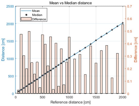 The collected statistical measures relating only to the distance measurement under LOS conditions are presented in Table 2. The mean values (dmean) are close to the median value (dmed), which indicates a relatively symmetrical concentration of the measurements around the mean. The difference is presented in Figure 4. The maximum absolute value of the difference between the mean value and the median value (|dmean−dmed|) is 0.6 cm (for the distance of 20 m).