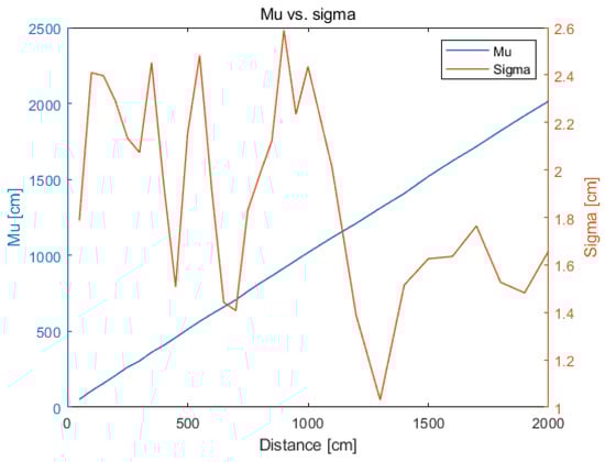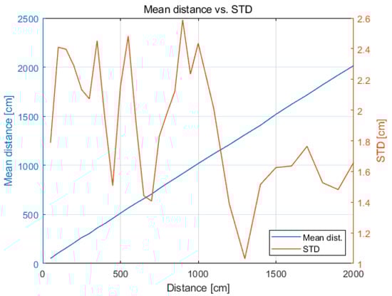 Standard deviation changes over the predefined range (from minimum to maximum distances value) and is in the range of 1.0–2.6 cm, as shown in Figure 5.