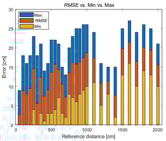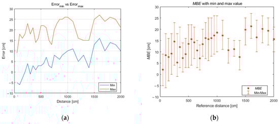 The maximum (εmax) and minimum (εmin) distance error (1) varies with distance without a clear correlation with a reference value of distance which is indicated in Figure 6a. The mean error range for this set of data is 14.8 cm, the minimum value is 7 cm (for a reference distance of 13 m), and the maximum value is 24 cm (for a reference distance of 1 m; see Figure 6b):