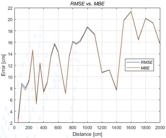Due to the dominant overestimation of the distances, the mean bias error () (3) is close to the , presented in Figure 8 for all reference distances. However, when the system overestimates and underestimates the distances, the differences between the and the increase. If the tested system is characterized by underestimation of the distance measurement, the will be negative and will significantly deviate from the value. Therefore, the value can be used to correct the distance in further data analysis during the position’s determination:
