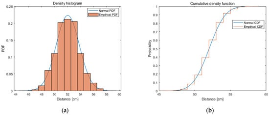 The parameters (mean value and standard deviation) of the normal distribution on the test sample of 10,000 samples were determined for all reference distances. An example of the probability density function and cumulative distribution function of the normal distribution, as well as the empirical functions, are presented in Figure 9a,b, respectively. Thus, it can be said that the normal distribution largely approximates the distribution of the analysed system and allows for the reproduction of the system’s operation.