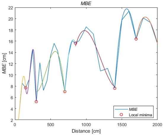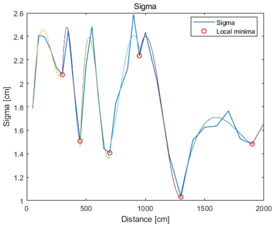 In the same manner as for the standard deviation, to represent the value in points between successive measurement points, the error change should be modelled. For this purpose, local minima were also determined with a minimum distance of three reference distances, and a polynomial of at the most third degree was approximated (see Figure 12).