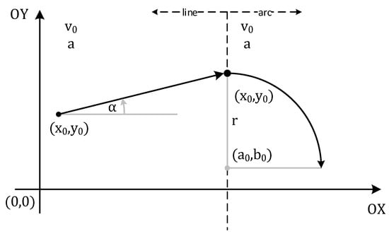 The first part of the simulator environment is the description of the test scenario (i.e., the movement path of a vehicle or an object). The considerations are limited to two-dimensional spaces. The vehicle’s route (car or RC model) is approximated by straight lines and arcs (the vehicles’ turning radius is limited), as shown in Figure 14. Combining straight lines and arcs makes it possible to define various test scenarios (paths of movements) that can be observed in road traffic, especially on junctions. That movement modelling allows for more straightforward adaptation of the virtual scenario in real conditions (e.g., by a driver or an autonomous vehicle). Thus, the vehicle motion is modelled by connecting the curves together, but the variable trajectory of motion is not the only determinant of how many curves the road consists of. The division of the path (and thus the motion) into segments depends on the following parameters:
