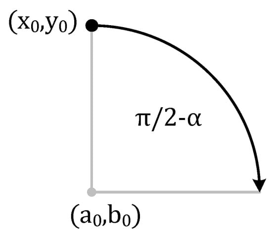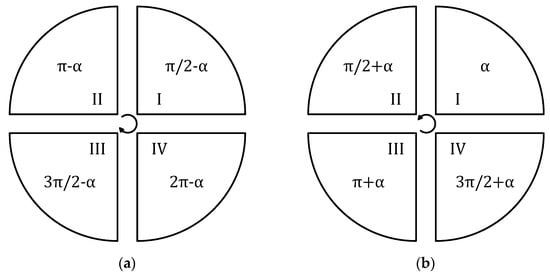 For example, for the starting point at an angle of 90° (1st quarter) and clockwise motion (see Figure 16), Equation (11) takes the form (13) and Equation (12) takes the form (14).