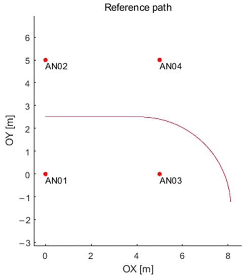 An exemplary path consisting of three segments with parameters is presented in Figure 20. The exemplary path contains three segments (two linear segments and an arc). The first linear segment is defined by a timeslot from t0 = 0 s up to t1 = 2 s, start position of x0 = −2.5 m, y0 = 9 m, an acceleration 5 m/s2, the initial velocity of 0 m/s and the direction of the movement (as the angle with the positive direction of the X-axis) equals 0 rad. The second segment (an arc) is defined by the timeslot from t1 = 2 s up to t2 = t1 + 1.2566 s, the initial position is the last position from the previous segment, the acceleration equals 0 m/s2, the initial velocity equals 10 m/s (it is a continuous value), and the arc radius is 4 m. The third segment is defined by the line within timeslot from t2 = 3.2566 s up to t3 = t2 + 0.83 s, the initial position is the last position from the previous segment (the arc segment), the acceleration equals 5 m/s2, the initial velocity 10 m/s, and the direction of the movement equals 3.1916 rad. The distances for the trilateration process are available for every data packet (12 times system interval). The distance between the tag to the four nearest anchors and the time shift of an object is included. Simulator output, i.e., a path calculated (by trilateration algorithm) using generated distances, can be seen in Figure 21. The data obtained may be further utilized for various purposes. Still, the most important is to have a reference path and a real UWB system simulator described by the proposed model.