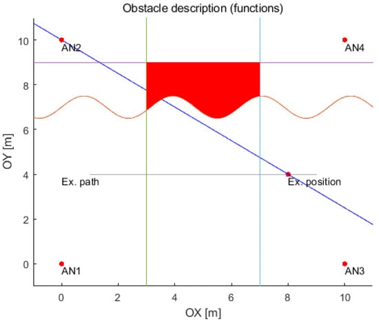 Introducing obstacles (not moving objects) in the simulator environment is an additional feature that gives much more possibilities of test scenarios. Other simulators do not offer LOS/NLOS detection with different ranging accuracy for them. The construction of an obstacle is based on its description with linear or nonlinear functions on the 2D plane, depending on the shape. For example, the set of functions describing one obstacle that should describe a bounded set is presented in Figure 18. Thus, the simulated transmission (distance) can be either in LOS or NLOS conditions depending on the current position of an object with respect to an anchor. Hence, each position on the track must be checked, whether the straight line passing through the tag and the chosen anchor cross the obstacle. In other words, it has been checked whether the line has at least one common point with the obstacle.