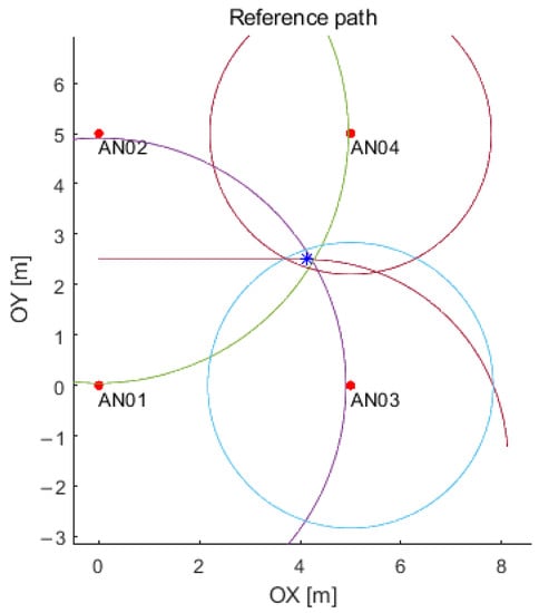 Euclidean distances between the tag and the anchors (15) are determined for each point on the reference path, where (, ) are coordinates of the k-th anchor and () are coordinates of the tag. The calculated distances are exact values and can be used as a ground truth for further testing of the developed algorithms.