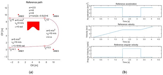 Internet of things (IoT) devices are ubiquitous and are presented in the industry and in houses where they provide a lot of information (i.e., allowing one to automate processes or take care about the safety or life of people). IoT devices are an indispensable element of smart cities or industry 4.0 (e.g., intelligent parking lots that provide information about available spaces and make it easier to find a previously parked car) [1]. Such devices are also used in sports or rehabilitation [2,3]. GPS and inertial navigation are widely applied to determine the position of an object [4,5]. However, in urbanized areas the GPS signal is often distorted or completely unavailable. Inertial navigation allows for positioning regardless of the infrastructure. However, the position error accumulates over the time [6]. Ultra-wideband (UWB) is a rapidly developing technology that has become a beneficial alternative/supplement to other systems used in the automotive industry due to its low energy demand, low costs, additional data transferability, and communication security [7,8,9,10,11]. The UWB technology enriches a range of network types that can be used in the IoT for smart city applications [12]. The UWB system, apart from the option of data transmission, allows for determining the position with high accuracy, which together with the growing interest in autonomous vehicles will be important in the smart cities or smart industries [13,14,15]. Positioning systems such as Lidar, radar, ultrasound, interaction sensors, or cameras provide information about the vehicle’s surroundings [16,17,18,19,20]. Their advantage lies in independence from infrastructure. However, they do not provide information about, for example, an obstacle located directly behind a sharp bend, and they do not inform in advance about a road collision or a traffic jam because they can only inform users about things they can see. To propagate information about dangers, vehicles must communicate with the environment (including other vehicles or infrastructure) [21]. The advantages of the UWB system, such as the aforementioned accurate positioning or the possibility to communicate, make this system widely researched [22,23,24]. For analysing the accuracy of localization algorithms (trilateration) or raw data processing methods, reference data (ground truth) is used to check their effectiveness and quality. Reference data can be obtained from any system, the accuracy of which should be an order of magnitude larger (lower error) than the accuracy of the analysed system. Another solution is to repeat a given test scenario many times while maintaining the same parameters. Then, the mean values from all approaches should be used as reference data. Due to the fact that the accuracy of the UWB system, with appropriate data analysis, is in the order of a few centimetres, the accuracy of the reference system applied has to be in the order of millimetres. In addition, the sampling frequency of the UWB system can reach 100 Hz, making it difficult to find a reference system. It seems that the best solution is to run a given test scenario multiple times and average the obtained results [25]. However, taking into account the measuring platform (and the whole test stand), which is a car or a remote-controlled model, it is almost impossible for a driver or a RC model operator to repeat the scenario many times while maintaining the same parameters.