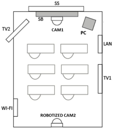 Technological devices deployed in a standard ‘Smart Classroom’: Sound system (SS); Smart-Board (SB); Camera 1 (CAM1); Robotized Camera 2 (CAM2); Television 1 (TV1); Television 2 (TV2); Local Area Network (LAN); Wi-Fi; Personal Computer (PC).