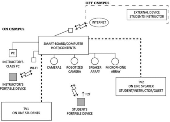 - Sound system: Microphones and speakers. Both devices allow the sound interaction between people that are physically in the classroom (on-campus) and those at home (off-campus). To have a complete interaction, those at home must use a device that includes their own sound system.