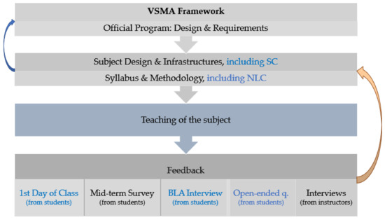 This study was focused on enhancing the design of a model based on the continuous adjustment of a subject once each cohort of students had completed the subject, as shown in Figure 5. This diagram includes different elements: the pre-existing elements are colored in black, while the new ones presented in this research work are colored in blue. In short, the different stages of the proposed model are: (1) To seek from the National Accreditation Board validation of a new official program that includes all the curriculum design, according to its framework for the validation (ex-ante accreditation), monitoring, modification and ex-post accreditation of recognized degree programs (known by its Spanish acronym VSMA) [61]; (2) If the proposal is accepted by the National Accreditation Board, the new program is implemented through different subjects according to the different methodologies, deploying new infrastructures in the campus facilities, if required; (3) To teach the different subjects of the program; (4) To receive and analyze feedback from instructors and students to allow the fine-tuning of each one of the subjects, while keeping the mandatory core elements officially approved. Hence, a user experience assessment on 2019–2020 and 2020–2021 students was carried out to adjust and refine the design of the subject once the collected data had been processed. This model was implemented with the aim of being potentially replicable in other third- and fourth-year management subjects imparted in the seven ICT engineering programs at La Salle URL. This continuous adjustment was initially planned to be carried out on an annual basis once students had completed all their class activities, including assessments. In order to complete the whole picture, if the changes to be made in the subject as a result of the analysis of possible improvements (brown arrow in Figure 5) are not consistent with the official degree program, these changes should go through a process of modification (M) or monitoring (S), according to the VSMA framework (blue arrow in Figure 5).